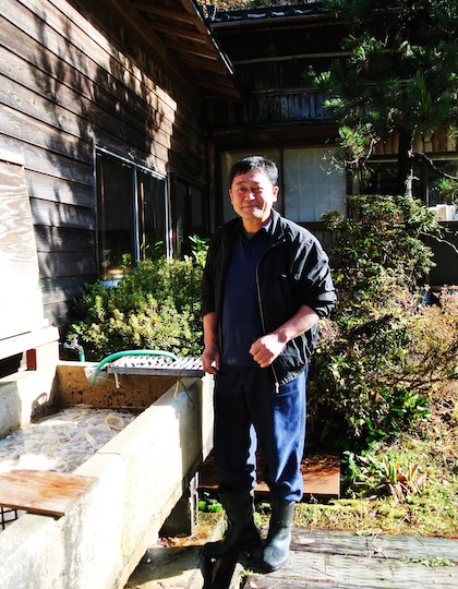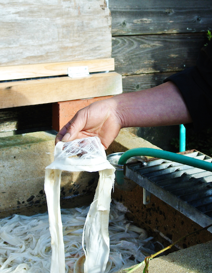 Tomi washing plant fibres outside his studio in Ishikawa prefecture