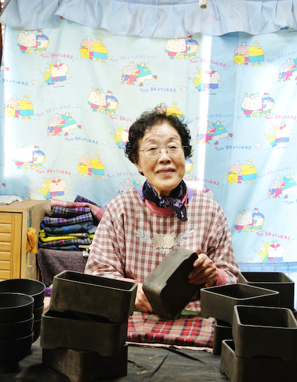 Fukushima is something of a Kutani-ware celebrity. Wrapped in a red tartan blanket to keep warm, he is reticent about sharing his story, but his daughter, Reiko, steps in to help.