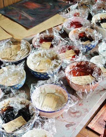 Hiko Toshiak applying coats of lacquer to bowls, left, and unused lacquer in various shades in colourful bowls at the studio