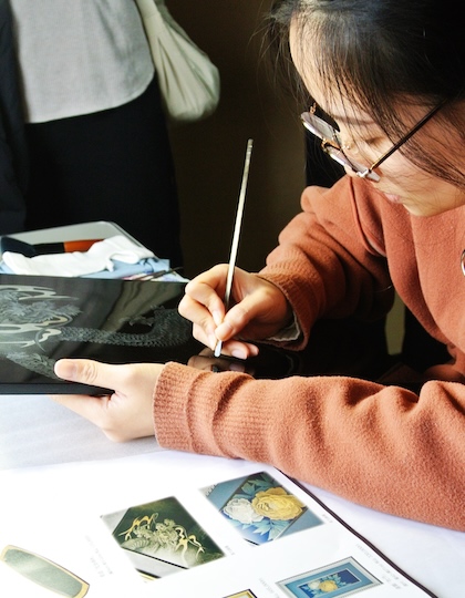 Entering a room next door, a young woman sits hunched at a desk, scratching at a highly polished black square. She’s etching a dragon, freeform, onto a block of lacquerware. Chinese national Akane Qin is 32 years old and recently moved to Japan to study the craft. Clearly, word of Ishikawa’s crafting renown has spread across the Sea of Japan.