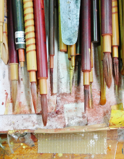 The studio holds the history of the craft: an old-fashioned flame heater, with a detachable kettle, keeps the room warm, and there’s a pile of tartan wool blankets tucked behind Hira’s desk, too. The light switch on the wall has a patina of fudgy, lacquer-stained fingerprints across it. Upstairs, in a storage room, colourful bowls covered with clingfilm hold unused lacquers of various shades, from white and blue to red and black.