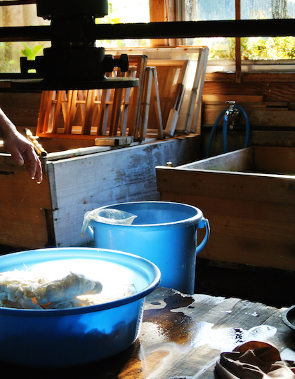 Making washi paper is deceptively simple. Tomi, a third-generation craftsman, specialises in coloured papers, made using natural pigments like indigo and chestnut to produce varying shades. I’m attempting to produce something a little simpler: an A1 piece of paper. In a large tub beneath the single-pane windows, translucent mulberry gloop glimmers.