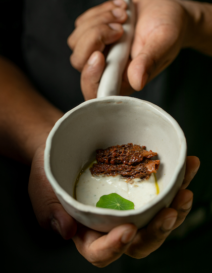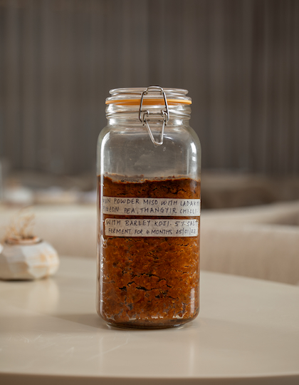 Fermentation plays a pivotal role in our kitchen – it's a technique deeply ingrained in the culinary traditions of my heritage. The kitchen's commitment to this method is reflected in our close partnership with Ladakh Basket, a social enterprise dedicated to transformative change and empowering women in the community while enhancing the region's biodiversity. This initiative is crucial as it addresses the erosion of Ladakh's culinary heritage, where foraging practices had ceased.We've also forged strong connections with the central-western regions of Maharashtra and the tribal communities in Neral and Palghar, exploring the freshest seasonal wild foods with these communities and aiming to reintroduce forgotten ingredients and reclaim culinary diversity. Foraging is at the heart of our philosophy; it emphasises resourcefulness and the championing of lesser-known produce. This philosophy places fermentation at the forefront of our culinary approach. In the high-altitude regions of Ladakh, we source indigenous ingredients such as skotse (wild garlic chives), kosnyot (wild caraway seeds), apricots, catmint, and more.