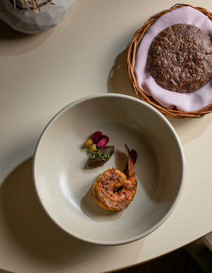 Tiger prawns and ragi bhakri, left, and fermenting gun powder miso paste
