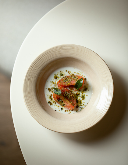Interiors at Noon, left, and a fermented heirloom tomato dish