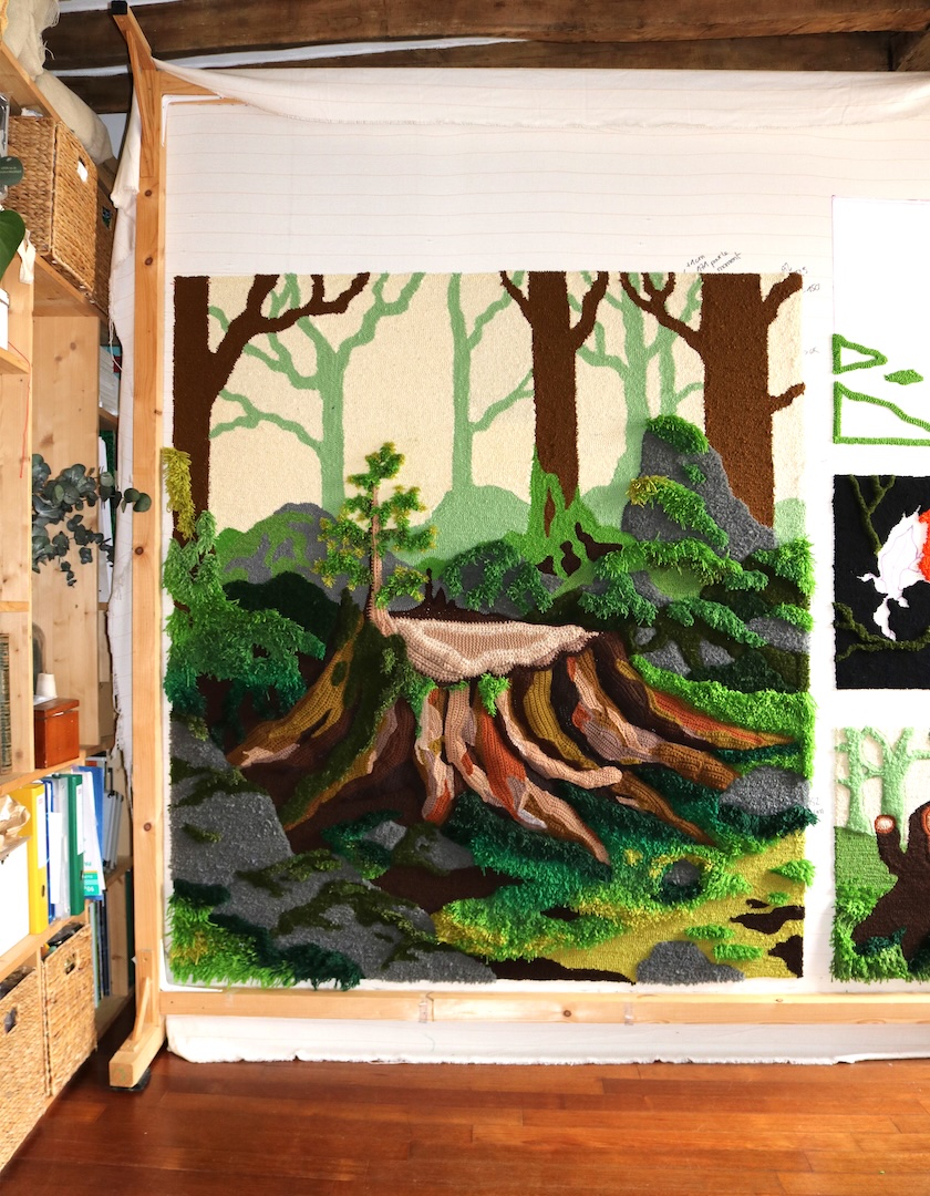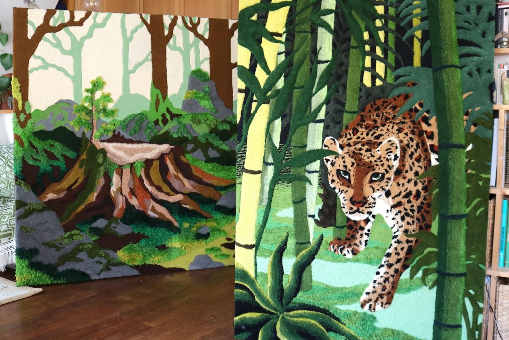 It all starts with the creation of a drawing that will be the visual for the tapestry. Either the impetus comes from a very personal desire, or it’s a commission. My first sketches are always done by hand, then reworked on Photoshop to define the chromatic range and the most harmonious format. Once the composition has been validated, I project and trace the drawing on my tufted canvas, followed by the realisation phase, including the choice of techniques for each element.I often use purely manual techniques such as knitting, crocheting and knotted stitch for the foregrounds, and these allow me to create much more assertive volumes. Once the tapestry has been completely covered with the various techniques, I glue the reverse side to ensure durability over time. The last stage is the finishing touches. This stage is quite magical. Using scissors and clippers, I cleanly redefine all the lines and create bas-reliefs: the tapestry comes to life.