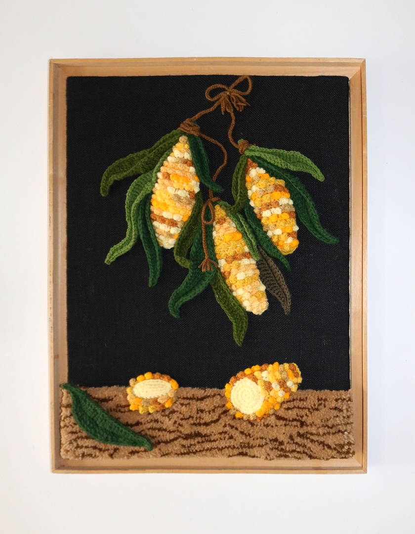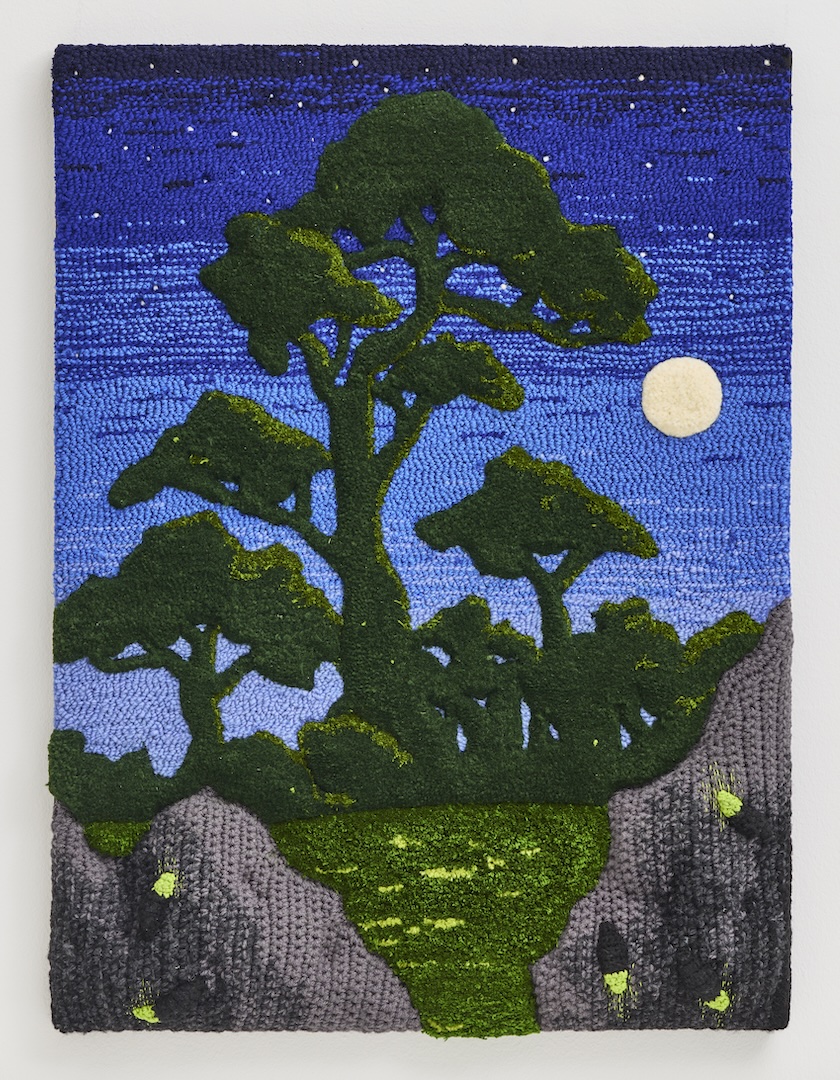 I often define myself as a textile painter. The different techniques I use, such as tufting, knitting, crochet and embroidery, are designed to make my drawings more lively and immersive. Textural and relief effects support the different planes of my compositions, which are often frontal, naive and synthetic in form. Colour also plays an important role in my paintings. Depending on the theme, I like to create either a peaceful, dreamlike atmosphere using monochromatic hues or, on the contrary, play on strong contrasts to generate a sensation of intensity and light.As for the themes that define my work, I often find it hard to choose just one. Still lifes, everyday scenes and realistic landscapes inspire me just as much as surrealistic settings or creatures. It also happens that fantasy subjects are mixed with the real thing; I don’t impose any rules on myself. The common theme that runs through all my work is that of nature, and the emotions of power, beauty, mystery and spirituality that emanate from it.