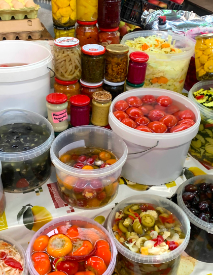 Lithuanian flags are as common a sight in the city as Vilnius' beloved ferments and pickles, seen here at a local farmer's market