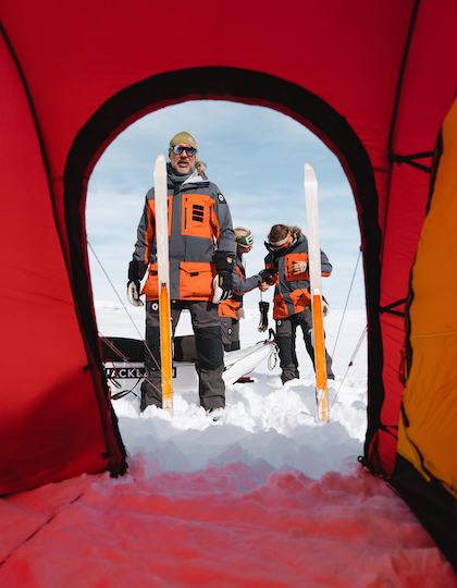As the day progresses, Rudd is who each of us naturally turns to for advice. Under his and Myers' direction, after 6.5km of sledding, we finally unclip our pulk harnesses and select a spot at which to set up camp, learning how to watch for crevasses, face the tent doors away from the wind, gauge avalanche risk and shovel out blocks of snow from under the tent vestibule to create a footwell and a place for the cold air to sink into. Later, having demonstrated how to prime the stove – essential in the extreme cold for it to work u2013 for melting snow, Rudd gathers all seven of us together in one four-person tent for nips of aquavit and stories of his experiences in life-or-death situations. Warmed by the booze and our freeze-dried meals, we hunker down.