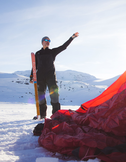 Hence, I find myself standing on this snowy ridge at sunset. Having initially hiked up to pee in privacy, I'm now caught up by the view and the stunning expanse. Down below, a squat conclave of red tents is tucked near the base of the hill. Overhead, stars prick the dense Nordic blue. I'm overtaken by a deep sense of peace – the kind that only a solid day's graft in the outdoors can deliver.
