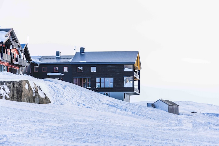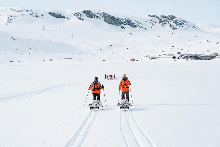 We sit down with them at a briefing session in one of the spare yet gracious wood-panelled rooms at Hotel Finse 1222 – in the very same room, it transpires, that Scott and Amundsen planned their own expeditions. As with the surrounding glacial landscape, Hotel Finse 1222 holds a storied place in the annals of polar exploration. Named partly for its elevation, partly for the surrounding village, it was originally built in 1906 to provide lodging for railroad workers, then reopened as an adventure hotel in 1909, and is still only accessible via a four-and-a-half journey from Oslo on the Bergen Railway. Climbing down from the snow train, you can virtually tumble straight from the platform into the hotel, which overlooks a scattered collection of low-rise houses around Finsevann lake.