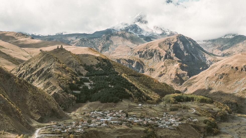 Whether February's avalanche of red roses and heart-shaped baked goods makes you want to run for the hills or ride off with your beloved into the (wildly remote) sunset, Stepantsminda provides. Getting to the townlet - known locally as Kazbegi - in Georgia's mountainous north-east, from the capital, Tbilisi, is half the fun. The three-hour road trip along the Georgian Military Highway takes in Ananuri's domed 1689-built Church of the Virgin, emerald-green rivers and reservoirs, cattle and sheep pastures, the vast Treaty of Georgievsk Monument - its bold tile mural contrasting brilliantly with the surrounding snowy peaks - and the odd roadside stand selling traditional sheepskin hats.