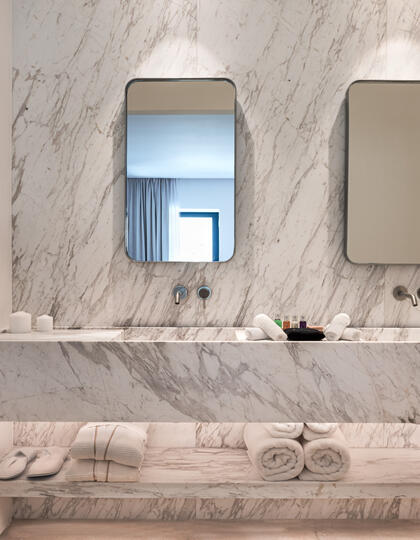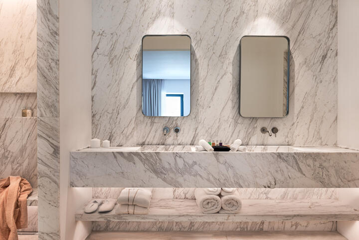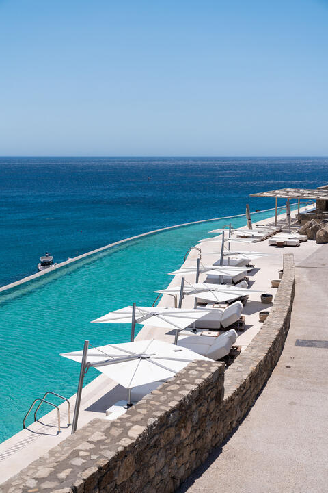 Poolside, you'll find a seriously impressive slap of blue Patagonia marble that's geared up for sin-free cocktail sipping. Each concoction comes with a shot of something healthy: think supercharged vitamin C shots in rum-based zombies, and mai tai mixed with matcha. Circle back past the reception-turned-juice bar for post-workout shakes and smoothies, or head to the restaurant bar for a menu inspired by Greek mythology - and a cellar stocked full of wines made with island grapes.