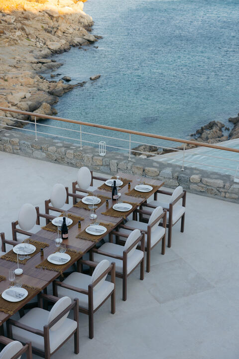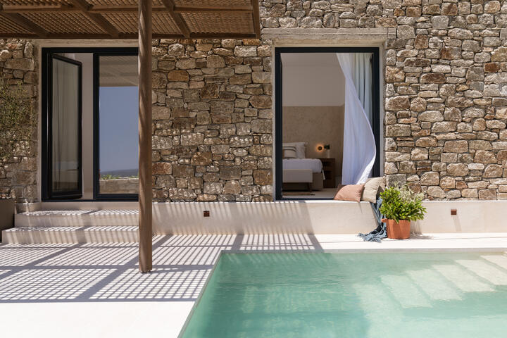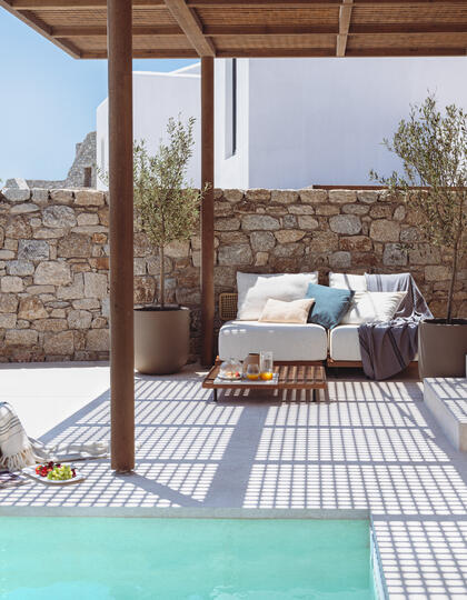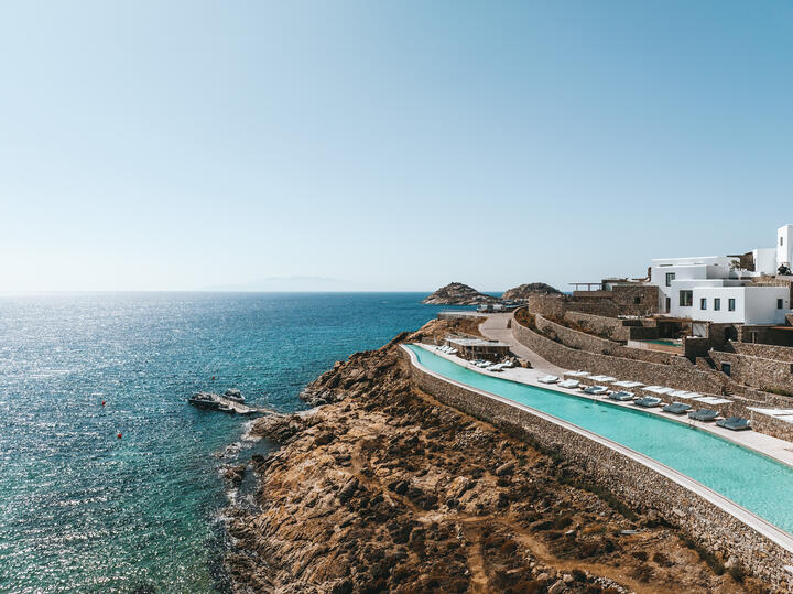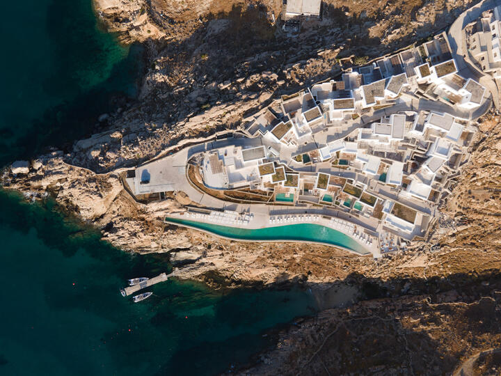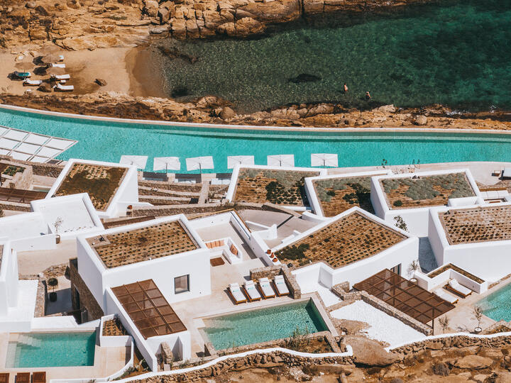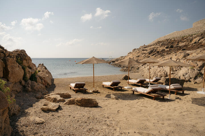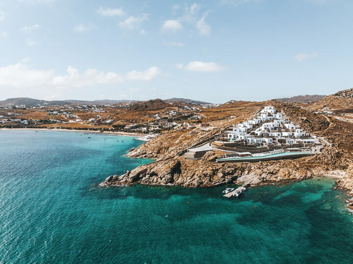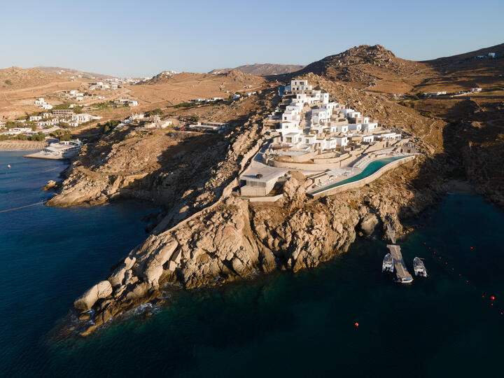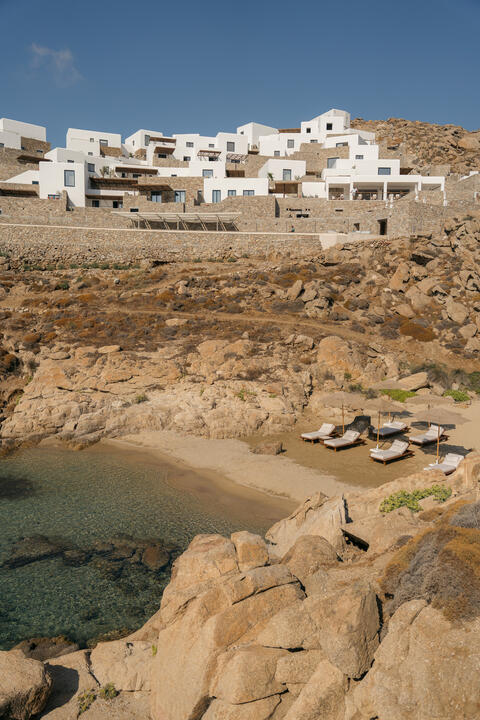 The (occasionally bumpy) journey to the 40-key property sets the tone: you'll snake past dusty fields and locally owned bakeries before you're greeted by an ancient olive tree and softly lit whitewashed miniature houses. The welcome continues with a homemade mint-spiked lemonade and a soothing soundtrack of crickets and the rush of the Aegean Sea below. It's a far cry from the fist-thumping soundtrack of Mykonos Town.
