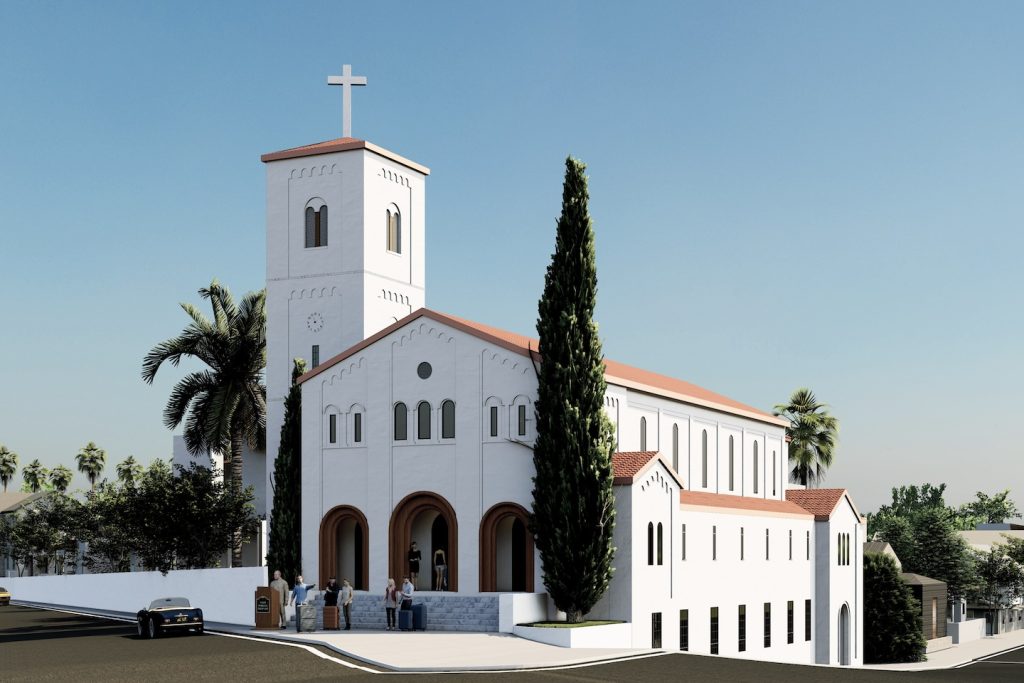 A rendering of Hotel Lucile’s ecclesiastical exterior