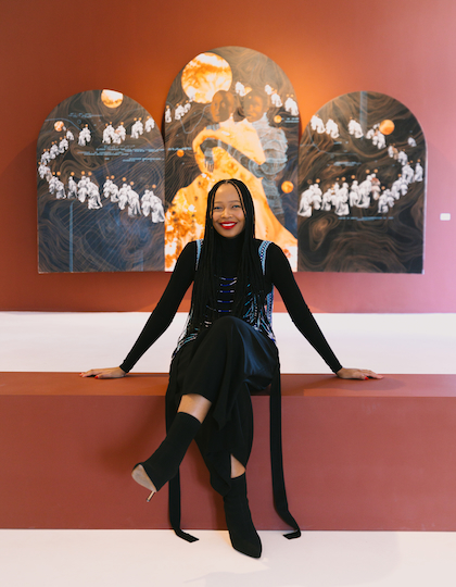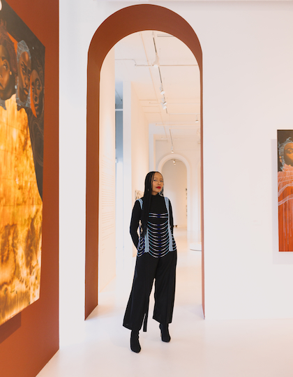 Asanda pictured at Southern Guild Gallery among Manyaku Mashilou's exhibition, An Order of Being.