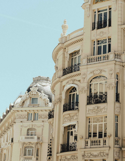 Palacio De Cristal in El Retiro Park, left, and elegant Madrid architecture | Credit: Alev Takil/Abbie Bernet/Unsplash