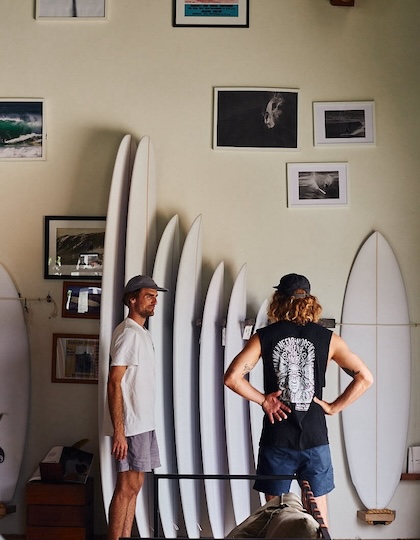 Brunswick Heads visitors, left, and surfboards at Byron Bay’s iconic McTavish shop