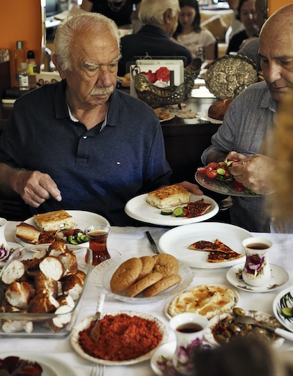 Mainland Anatolia, meanwhile, has a harsh climate and the cuisine is largely based on wheat, legumes, dairy, savoury pastries and mutton. Eastern and southern Anatolian cuisine is rich in bulgur-based dishes, as well as kebabs, flavourful condiments, such as pomegranate molasses and pepper paste, and local cheeses. Gaziantep in southeastern Anatolia grows some of the finest pistachios and is home to the best baklava. The climate is hot and dry in summer, perfect for drying and preserving. Şanlıurfa in the region is famous for its smoky isot (Urfa chilli pepper). The Black Sea region produces the nation’s tea leaves, hazelnuts, corn and collard greens, along with the much-loved anchovies (hamsi). The milder climate in the Aegean and the Mediterranean lends itself to seasonal fruit and vegetables, olives, herbs and wild greens.