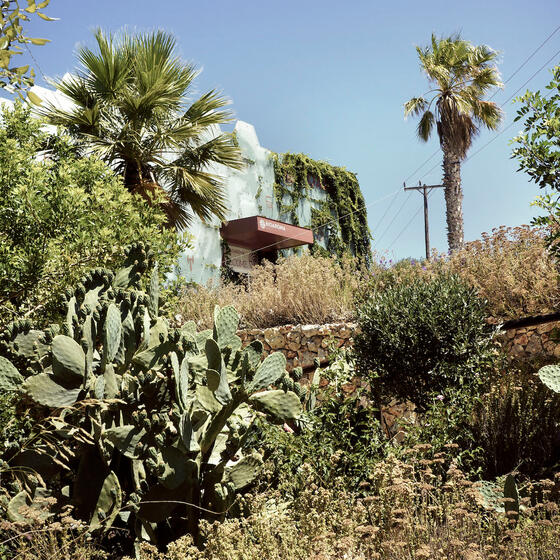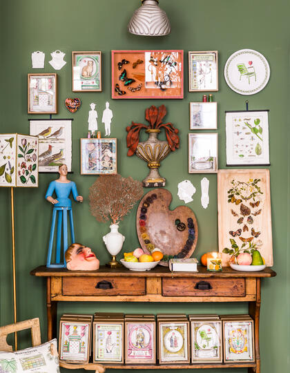 Marin Montagut's art-filled shelves, left, and its green and glorious facade.