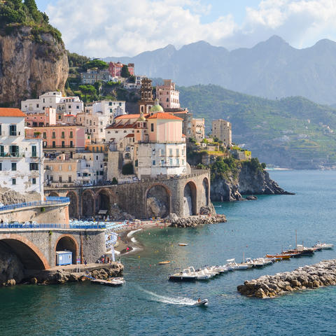 Bypassed in favour of the headline towns such as Positano and Amalfi, Atrani is the Amalfi Coast's best-kept secret. Nestled between two cliffs, it's the smallest hamlet in southern Italy and one where, along steep alleys and peeling paintwork, you can sink into the laid-back vibe. Sorbet-hued dwellings cluster around the medieval piazza, from where a passageway leads to the Tyrrhenian Sea. Attractions include the 10th-century Church of San Salvatore de' Birecto and the Grotto of the Saints, a natural cave decorated with Byzantine frescoes.