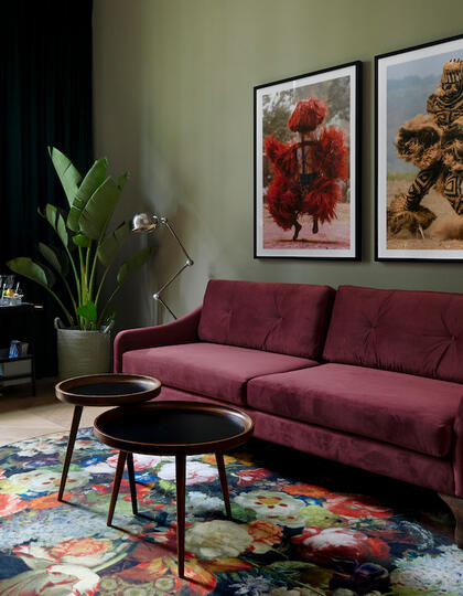 Interiors designed by Jo'burg's Tristan du Plessis are masculine and moody, the tenebrosity of sculptural concrete and steel beams lifted by a colour palette of greys, greens and burgundy. Art lovers will be impressed; in the lobby, you're greeted by a bronze pig, standing sentinel beside a map of the city centre made from 1,800 hand-painted Delft tiles, an artwork by Cape Town ceramicist Lucie de Moyencourt. The ceiling - a coiffed cloud of colourful netting - floats above the statement carpet below. Throughout the hotel, graphic serpentine loops by locally based multidisciplinary artist David Brits are splashed across walls.