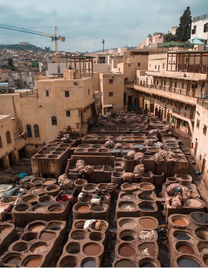 … the Chaouwara Tanneries, where you can watch the process of leather making. Head deep into the clusters of leather shops to get to the heart of the action, and time your visit for the morning when the pits are filled with coloured dye. While the smell might be off-putting (methods from medieval times are still used, employing ingredients such as cow urine and quicklime), this is Fez's most iconic sight.