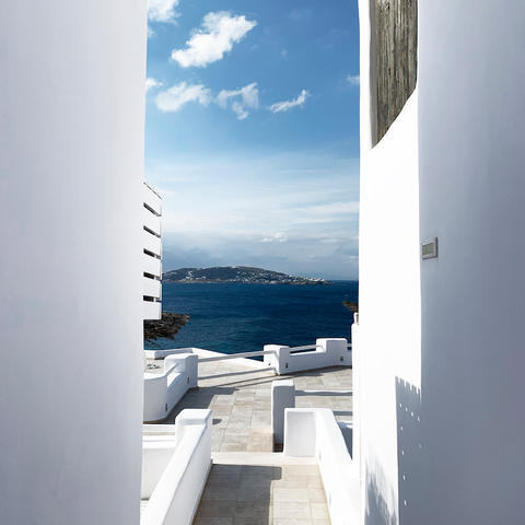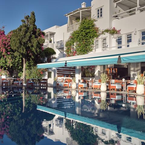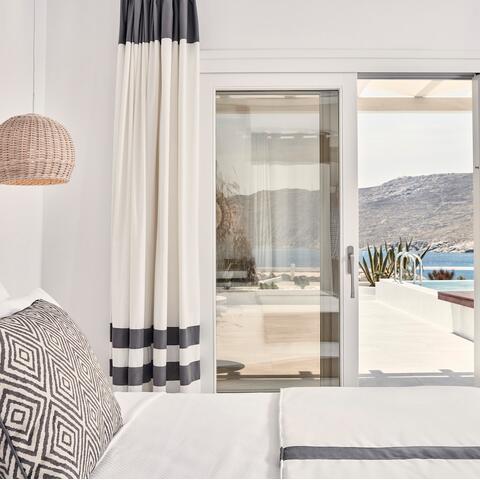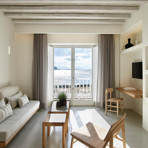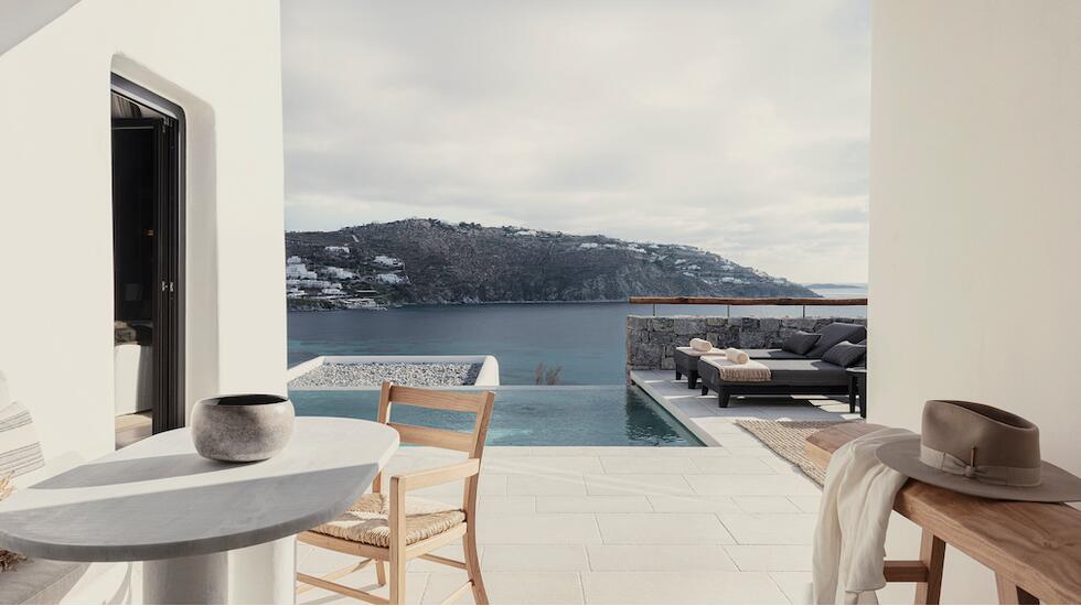 Sleek, slick and minimalist, this Ornos Beach pad is a favourite with the Emirati crowd, thanks (in part) to a new direct Doha-to-Mykonos flight launched this summer. Bedrooms are polished, with a calming colour palette of seashell neutrals, poured concrete floors and rose gold accents throughout, while private plunge pools in some suites offer marina views. It's just 10 minutes from Mykonos Town, so expect to meet the party crowd. We spotted a certain Victoria's Secret model tucking into a health-boosting breakfast of fresh fruit on our visit (and no, we can't confirm if watermelon is a successful remedy for a sore head).
