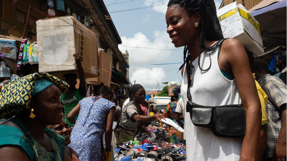 Nowhere is that better epitomised than at Balogun Market, a sprawling maze of buildings and alleyways where traders sell everything and anything: food, clothes, hair extensions, electronics - even visas, or so the joke goes. My photographer for the week, Lagos-born Kadara Enyeasi, advises me to "walk with purpose" in order to navigate the constant calls of "aunty" from traders beckoning me to their stalls and occasionally pulling me gently by the arm. "And at least try to look like you know where you're going."