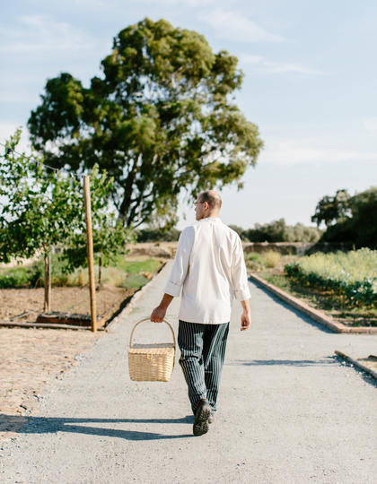 As 6pm approaches we make our way to the vegetable garden where we meet our chef for the evening and begin to forage for our dinner. Here the seasons rule above all else and we learn about the garden's strict planting calendar while wandering through raised beds of organic crops. Beetroots are cut at the root and lettuce at the tusk before being placed in the chef's weighty wicker basket. By now cows have gathered at the perimeter of the vegetable garden - as I'm told they do most evenings - casting judgemental glances over our hoard.